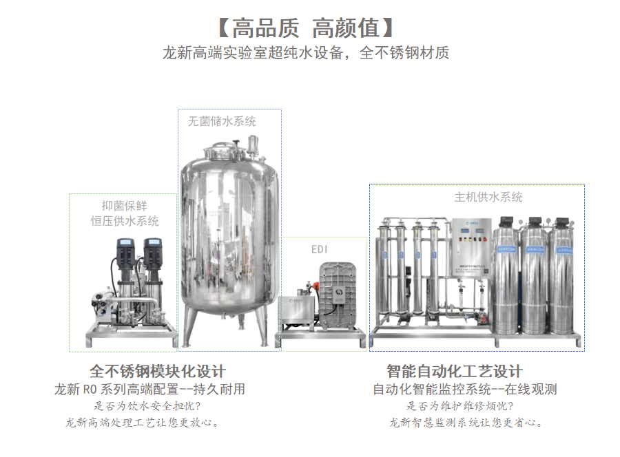 高端實驗室超純水設備Q2系列采用雙級RO+EDI+拋光+消毒電超純水工藝;原水水質是市政自來水、水質指標符合GB/5749生活飲用水衛生標準,水質符合《分析實驗室用水規格和試驗方..